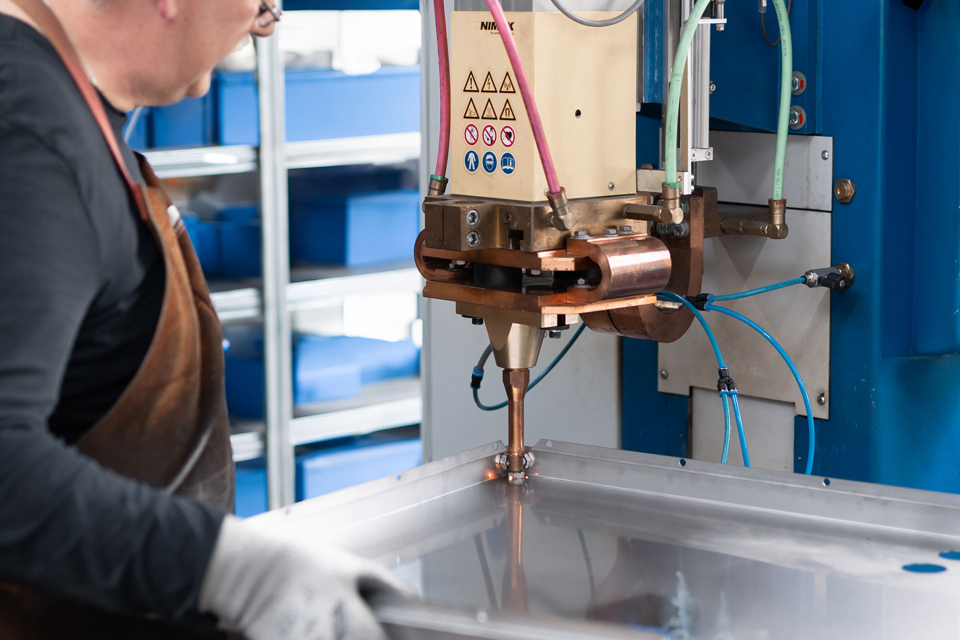 Zu den weiteren Schweiß-Dienstleistungen bei HOF gehört das Widerstandsschweißen - speziell das Buckelschweißen und Punktschweißen. Im Gegensatz zu den klassischen Schweißverfahren wie MIG/MAG oder WIG, bei denen Wärme durch einen Lichtbogen erzeugt wird, basiert das Widerstandsschweißen auf elektrischem Strom und Druck. Das sorgt für schnelle, saubere und reproduzierbare Schweißverbindungen - ganz ohne Zusatzwerksstoffe, wodurch das Grundmaterial "rein" bleibt.